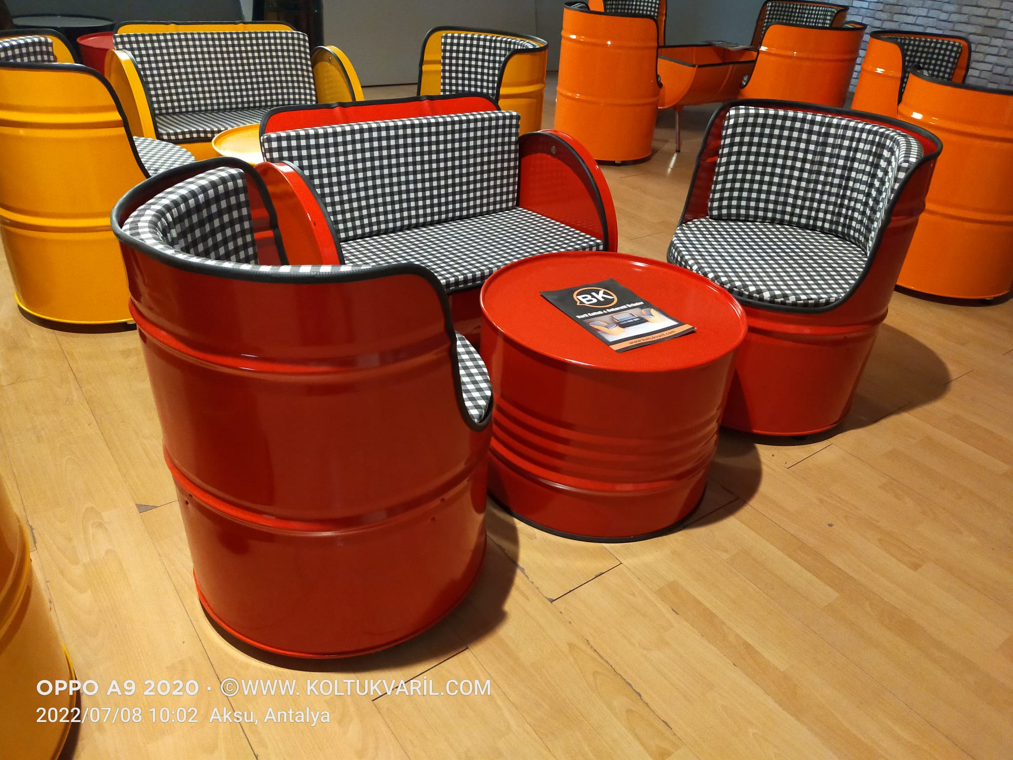 Varil Koltuk oturma takımı bir adet ikili, koltuk iki adet tekli koltuk ve bir adet sehpadan oluşmaktadır.